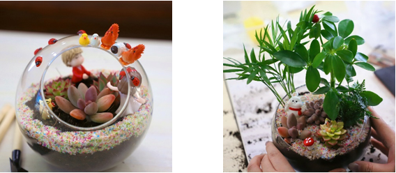 活动开始,兴趣小组邀请了从业多年的专业花艺老师在现场为大家进行讲解,从种植材料及步骤到养护的注意事项都进行概述和说明,之后对大家的实操进行辅导。在微景观容器中布置从岩石层—土壤层—苔藓层—植物层进行,很多员工选择了玻璃瓶器,根据自己的想法和喜好,有的用银线蕨、网纹草,有的用罗汉松、袖珍椰子等植物进行装扮,还有的员工选择了多肉,搭配木盒别有一番趣味。搭配了彩色的河沙,透明的雨花石,还装饰了一些可爱的小摆件,构造起了自己独特的微景观。